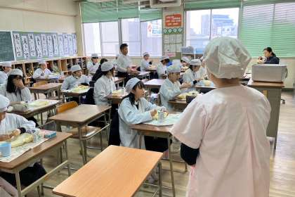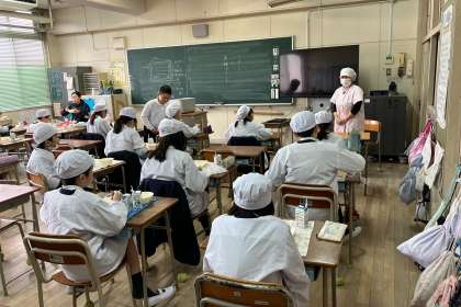 今日は、5年生が給食調理員さんに感謝を伝えて、質問をしました。