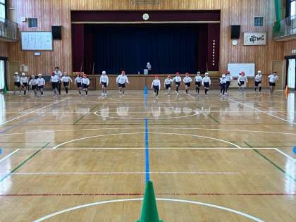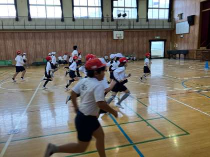 シャトルラン中です。先程のグループでは、79回という子がいました。
