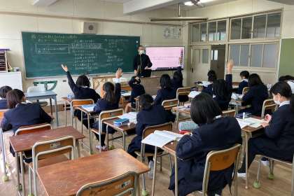 少人数授業の形態で、段の数と周りの長さの関係について、表を使って調べる学習をしました。