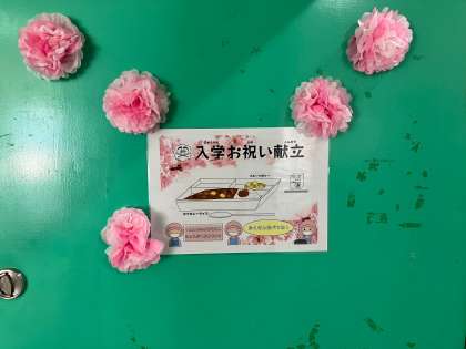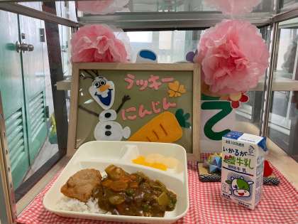 入学祝い献立のカツカレーです。給食調理員さんの温かい気持ちとして、ラッキーニンジンとして、普通と違った切り方のニンジンがはいっていらそうです。
