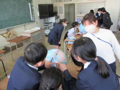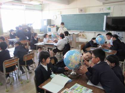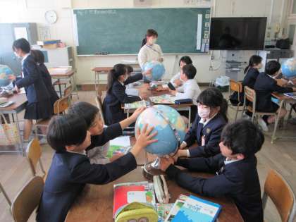 地球儀を見て、いろいろな国の位置を調べました。