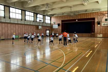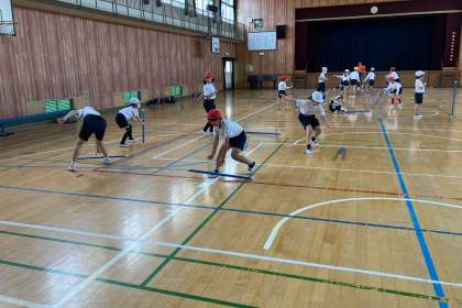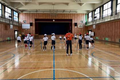 一人ひとりが棒を立てて、みんなで声をかけて呼吸を合わせて、隣の子の棒を倒さないように移動することをしました。なかなか成功しなかったのですが、最後の最後に奇跡的に、一本も倒れずに終わることができめした。