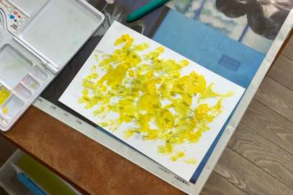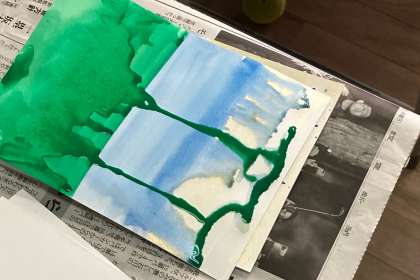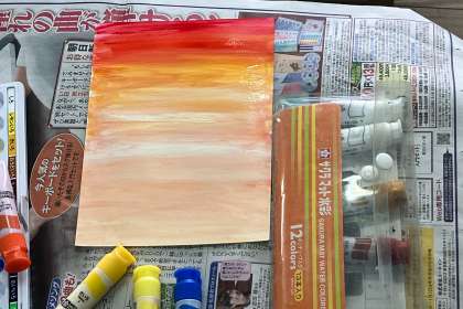 筆に絵の具をつけた後、筆を振って絵の具を散らして良いし、とにかく自由に絵の具と筆を使って描きました。