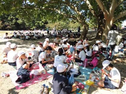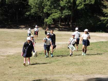 10月16日(金) 快晴の空のもと、1年生から6年生まで全員で服部緑地公園へ出かけました。全校たてわり班でのオリエンテーリングです。公園内のポイントを回り、ポイントごとの課題をクリアしながらゴールをめざします。迷う班もなく、30班のすべてがゴールしました。低学年の子たちもとても楽しい表情で、ポイントを回っていました。その後、各班ごとにお弁当タイムです。大きな木陰がとても気持ちよく、いつもと違うメンバーで食べるお弁当は、また格別です。