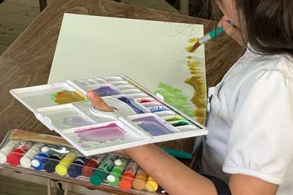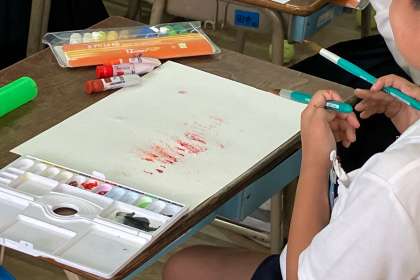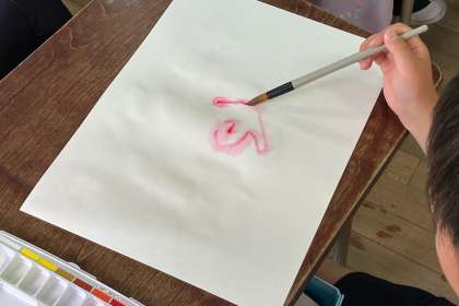絵の具、水、筆でいい感じの形や色を見つける学習をしました。大きいサイズの画用紙で描いた後、もう一枚は小さいサイズの画用紙に、一枚目と違う感じの表現をしました。