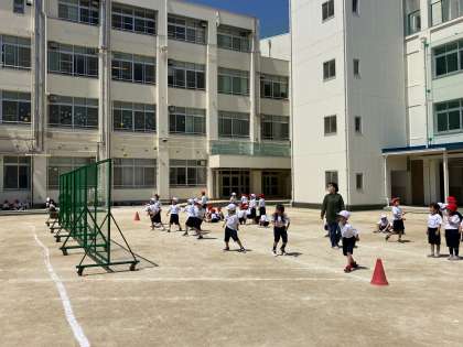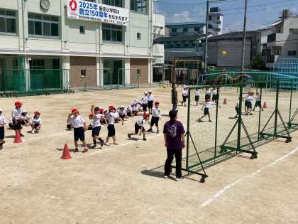 ソフトボール投げの練習で、できるだけ遠くに投げられるように、前に防玉ネットを置いて練習しています。