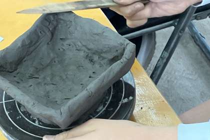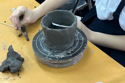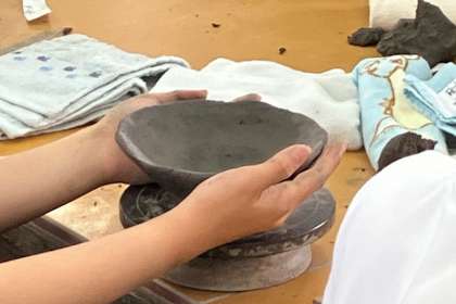 作陶体験中です。子どもたちそれぞれの思い出の作品となると思います。一人ひとり、よく工夫を凝らした作品になっていきいます。