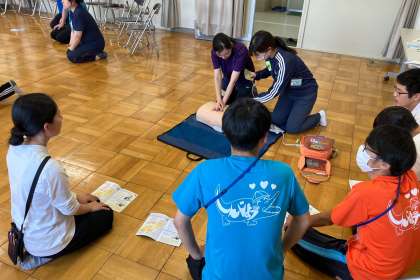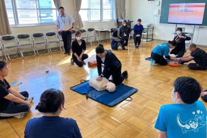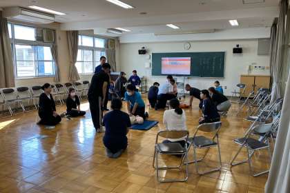 教員、PTAの方にもご参加いただき、救命講習会を行いました。