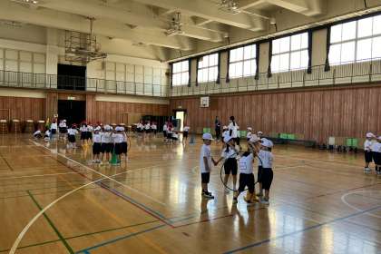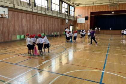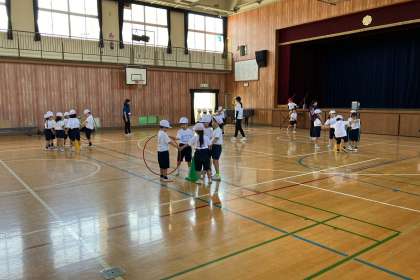 グループで手を繋ぎ、輪を通していく運動をしました。
