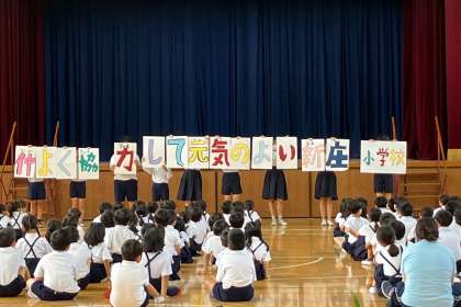代表委員会の子どもたちが考えた学校目標を発表しました。