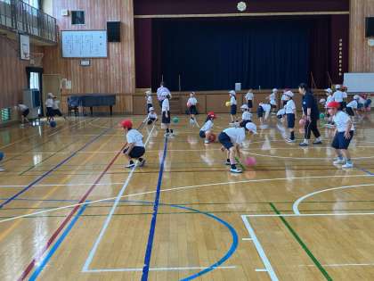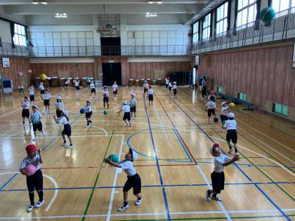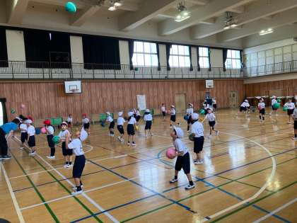 今日は、プール水泳をせずに、講堂でボールを使った運動をしました。