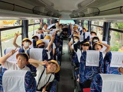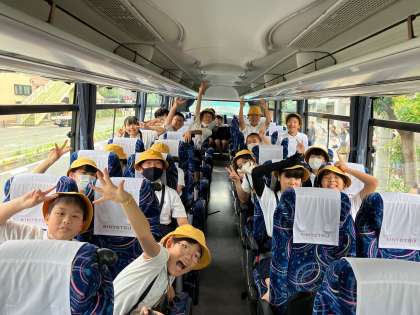学校にて、出発式を行ったあと、大勢の保護者の皆様のお見送りをあとに、ハチ高原に向けて出発です。いってきます。