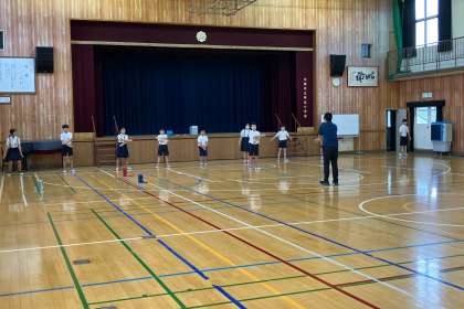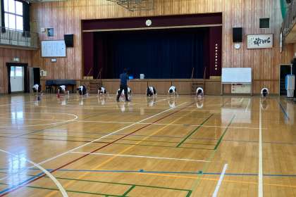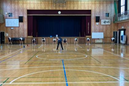 運動委員会の子どもたちは、運動会の始めに準備運動を行う時に、前に出てみんなのお手本になるので、練習をしました。