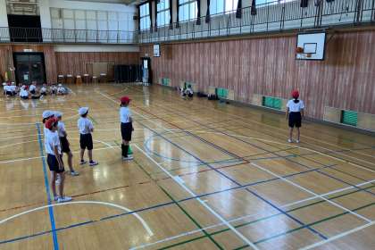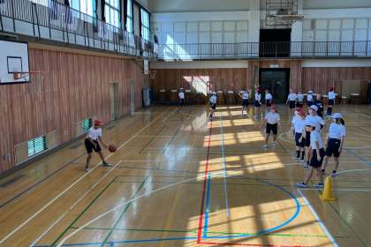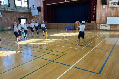 バスケットボールの学習で、パスからシュートに結びつける練習をしました。