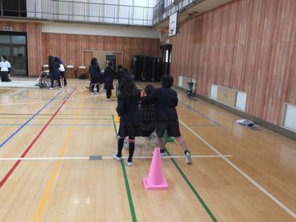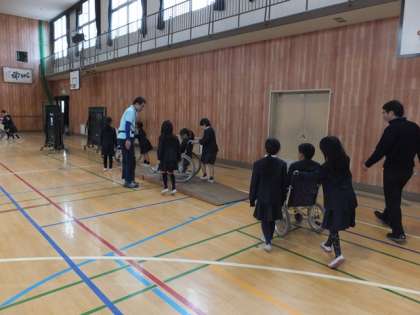障がいのある方から生い立ちや生活の様子についてお話しいただき、事前に考えた子どもたちの疑問にも答えていただきました。その後、車いす介助をする上で気をつけることなどをお話しいただき、三角コーンやスロープで作ったコースを実際に移動する車いす体験をしました。東淀川区社会福祉協議会の方々にご協力いただき、17台の車いすをお借りすることができたので、3人一組でスムーズに体験ができました。