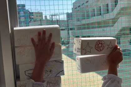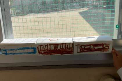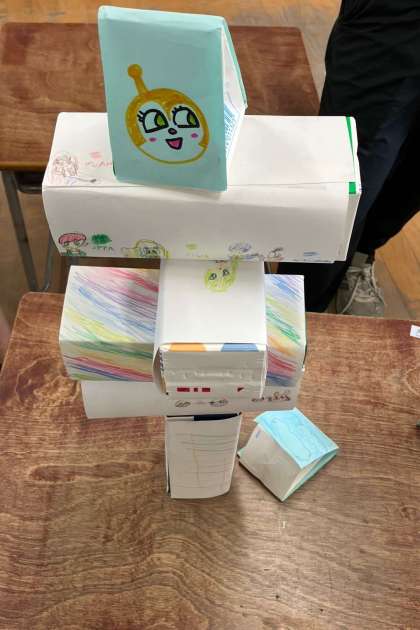 先週の続きで、積み木作りをし、完成したものを積み重ねてみました。