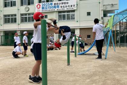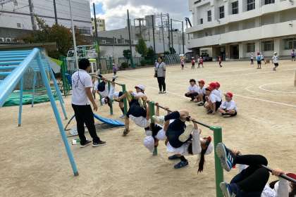 鉄棒の技として、逆上がりやこうもりを練習しています。