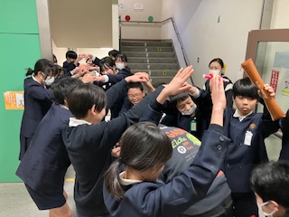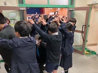 終わりは、子どもたちが作ったアーチの下を教職員が通って行きました。