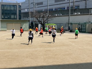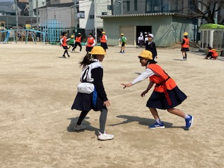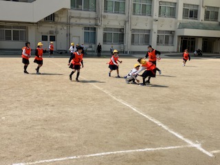 4年生、お楽しみ会で、タグを抜きあうゲームをしました。