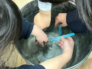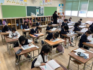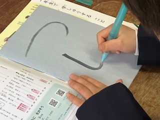 1年生、水を吸い込ませた筆を使って、これまで学習した字を書いてみました。