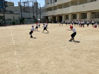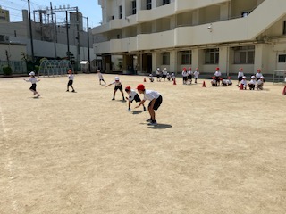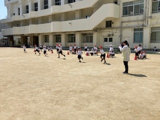 走っていて笛の合図でストップしり、横向き走ったりする運動をしました。みんなよく動けていました。