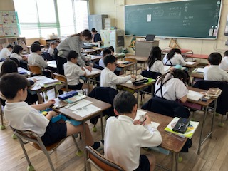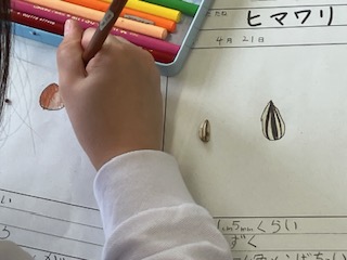 ホウセンカとひまわりの種を虫眼鏡で観察して、それぞれの絵を描きました。