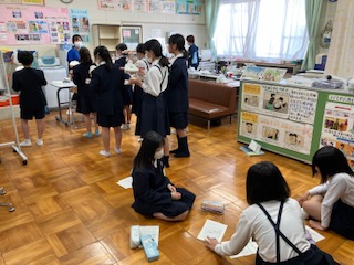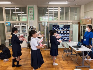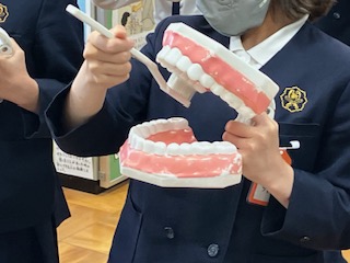 保健委員会です。歯磨きの仕方を広める取り組みの練習です。