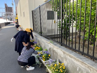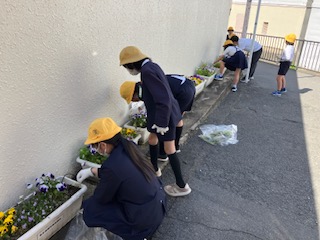 飼育美化委員会です。学校の周りにあるプランターの草を抜きました。