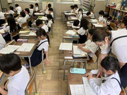 先生の説明を聞きながら、初めてのテストをしました。