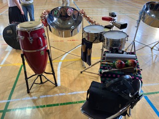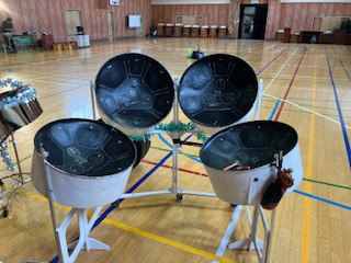 ドラム缶からつくられる打楽器を使って、楽しく陽気なリズムからクラシックや、アニメソングまで、カリブのリズムを演奏してくださいました。スチールバンドの皆さんが、楽しく盛り上げてくださいました。子どもたちはのりのりで、手拍子をしたり踊ったりしました。