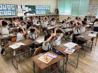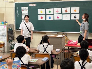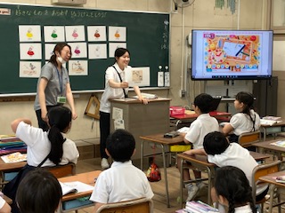 黒板に掲示してある単語から、C-NETの先生が選んだものが正しいければ、机上の消しゴムを取り合うゲームをしました。