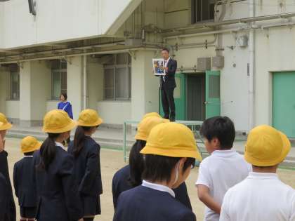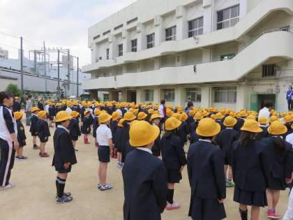 始業式から1週間がたちました。今日が運動場で全校朝会をする初めての日です。新しい学年の場所に並び、きちっと整列をして校長先生と朝の挨拶をしました。