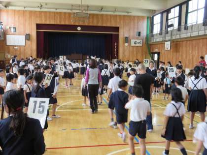 まず6年生の班長が講堂で班の番号を書いた用紙を持って待っていて、他の学年の友達が来るごとに自分の列に並ばせていました。集会が始まるとどの班もすぐに円になって座り、6年生から自分の名前などを紹介していきました。