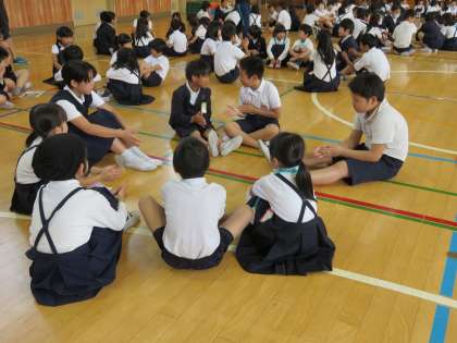 木曜日は児童集会の日です。今日の児童集会はたて割り班ごとに集まって一人ずつ自己紹介をしました。