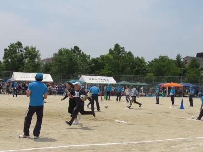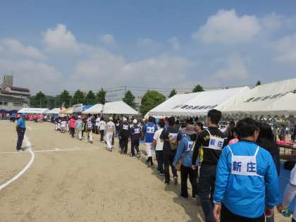 少し暑さも感じる快晴のもと、『東淀川区健康の日の集い』が豊里中央公園で行われました。みんなで入場行進をした後に開会式があり競技が始まりました。