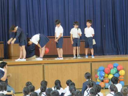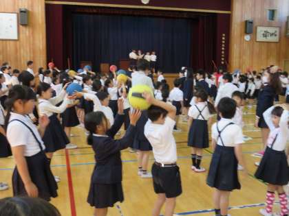 6年生が1年生に渡すときには、身長差もあって大変そうでしたが、そこがたて割り班の面白いところでもあります。いろいろな学年が一緒になって協力しながらゲームをしていました。