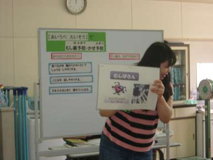 ○×クイズなどを取り入れながら、虫歯の原因について考え、虫歯予防に効果的な「あいうべ〜体操」を実践しました。