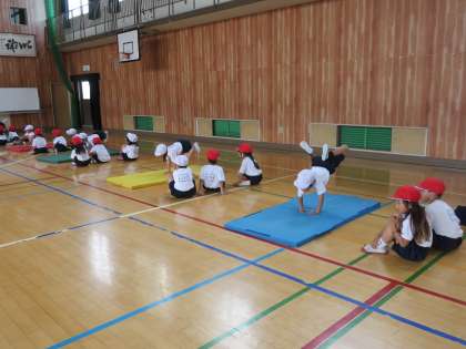 3枚の写真は、手をついておしりを持ち上げ両足でたたくというものです。手で体を支えるバランスも必要ですし、足をたたくという動作も同時にしなければいけません。1年生にとっては難しいと思いますが、みんながんばって練習していました。