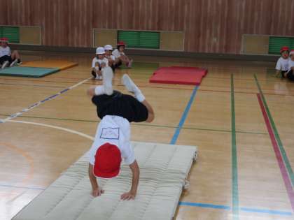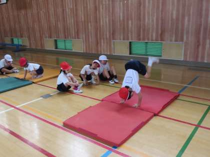 でんぐり返りをしたり、マットに手をついて左右に跳んだりとマット一つでもいろいろな運動ができます。
