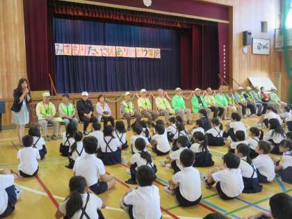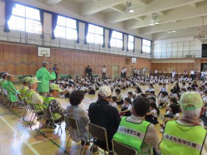 17名の見守り隊の皆さんに来ていただき、自己紹介をしていただいたり子ども達が感謝の言葉を言ったりしました。
