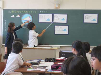 今年の本校の研究教科は算数です。算数の授業から“自分の考えを友達に伝え合う活動を通して、自分から学ぼうとする子どもを育てる”ためにはどのような手立てをすればいいのかを研究のねらいとしています。