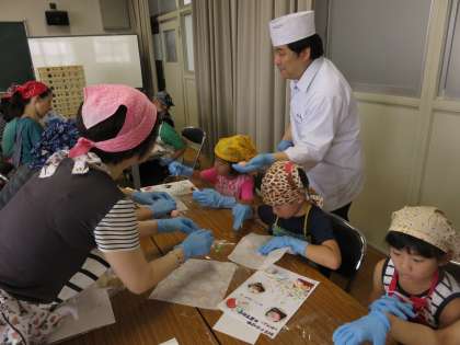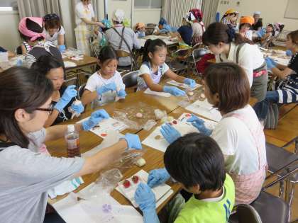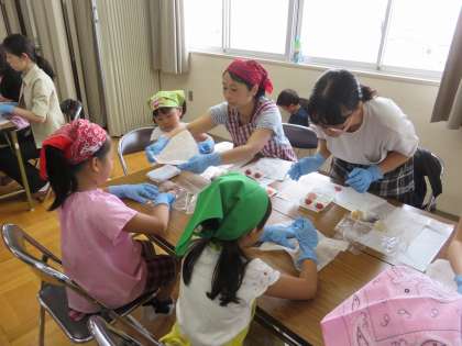 親子で3種類(牽牛花【アサガオ】・ネコ・いちご餅)6品を作りました。少し子どもにとって難しいところはお母さんやお父さんが手伝ったりしながら、どのテーブルも和気あいあいな感じで作ることができました。