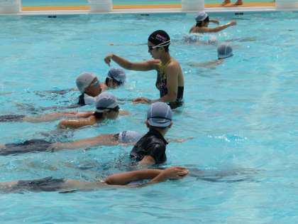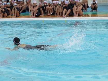 同じく3時間目はプールでの実技指導です。まず中西選手の模範演技を見せていただきました。クロールやバタフライ・・やはりオリンピック選手の泳ぎとあって、子ども達の目の輝きが違いました。