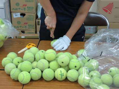 テニスボールを押さえて、まずキリで穴をあけ、次にナイフをその穴に差し込み十の字の切れ目を入れます。子ども一人に机4いす4で8個のボールが必要なので、今日一日で2000個以上のボールに切れ目を入れたことになります。