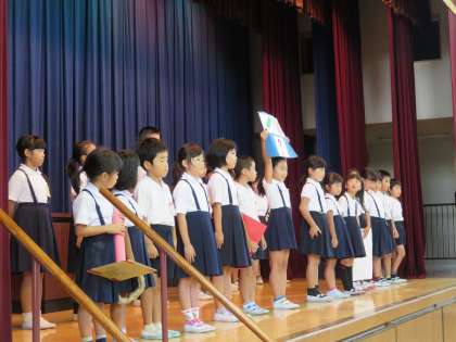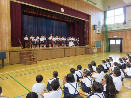 今日は2学期初めての児童集会がありました。今日の集会では、来週に行う『夏の集い』で各クラスで準備しているお店の紹介をしました。