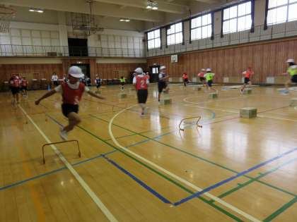 まずは踏み切り足を意識したウォーミングアップトレーニングを講堂全体で行いました。そのあとは、グループに分かれて自分の走っている様子を映してもらいながら、みんなでいろいろと話し合いました。