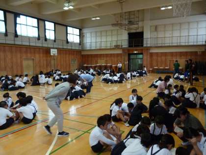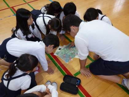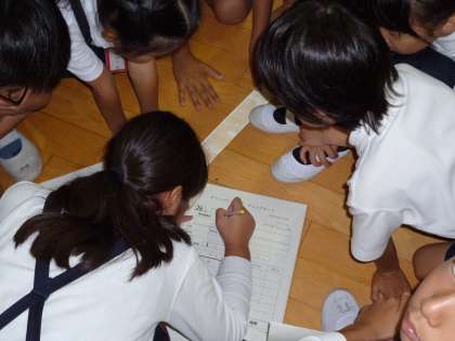 今日の児童集会は、オリエンテーリングに向けて縦割り班でミーティングをしました。