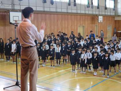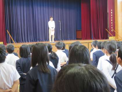 本校では今週は『家庭学習がんばり週間』としています。まず全校朝会では、中学校から教務主任の先生に来ていただき、学校の勉強と同じくらい自分から勉強する“自主学習”が大切であるという話をしていただきました。