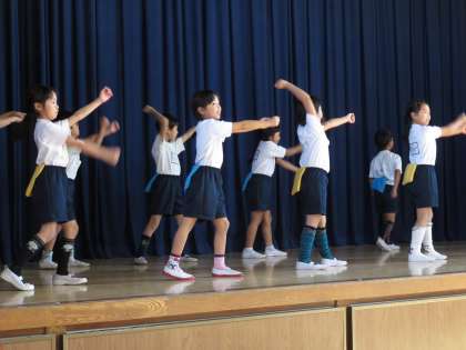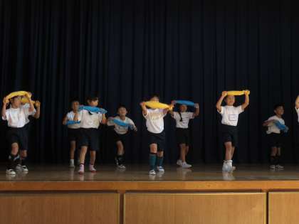 舞台の上は運動場と違ってちょっと滑りやすいですが、子ども達は一生懸命に踊っていました。運動会の時にも思いましたが、やはり子ども達の表情がとてもよかったです。