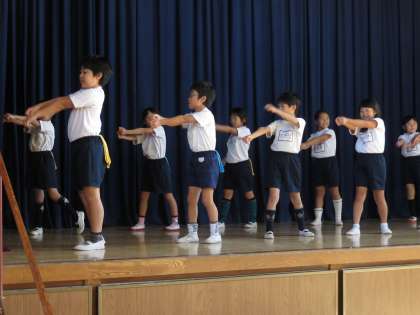 その時に2年生の有志の子ども達が、運動会で踊ったダンスを講堂の舞台の上で披露してくれます。今日はその練習を昼休みに行っていました。